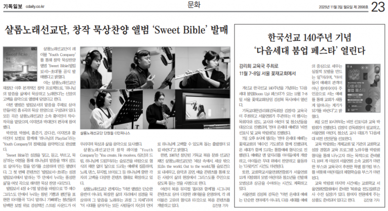 [기사] 샬롬노래선교단, 창작 묵상찬양 앨범 ‘Sweet Bible’ 발매(기독일보)