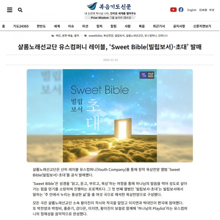 [기사] 샬롬노래선교단 유스컴퍼니 레이블, ‘Sweet Bible(빌립보서)-초대’ 발매(복음기도신문)