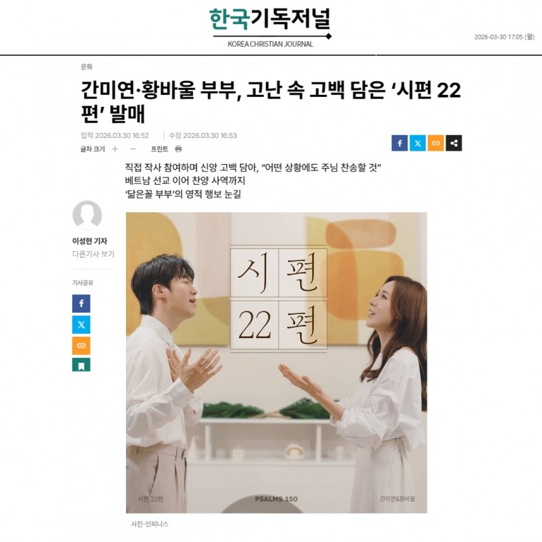 [기사] 간미연·황바울 부부, 고난 속 고백 담은 ‘시편 22편’ 발매(한국기독저널)