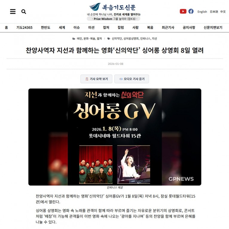 [기사] 찬양사역자 지선과 함께하는 영화‘신의악단’ 싱어롱 상영회 8일 열려(복음기도신문)