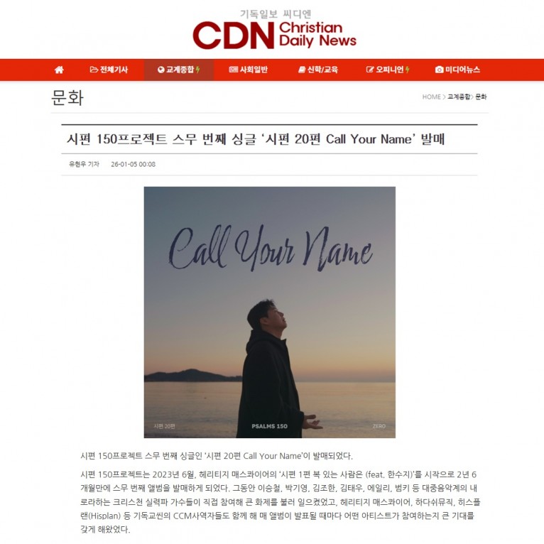 뮤직타임 [기사] 시편 150프로젝트 스무 번째 싱글 ‘시편 20편 Call Your Name’ 발매(기독일보 씨디엔)